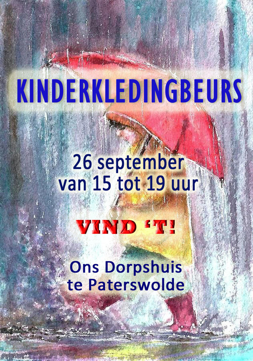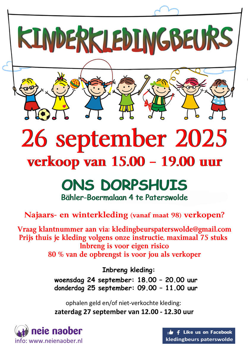 Vrijdag 26 september organiseren onze vrijwilligers van 15.00-19.00 uur weer de Kinderkledingbeurs in Ons Dorpshuis te Paterswolde. De Dameskledingbeurs vindt op vrijdag 10 oktober van 14.00-20.00 uur plaats.