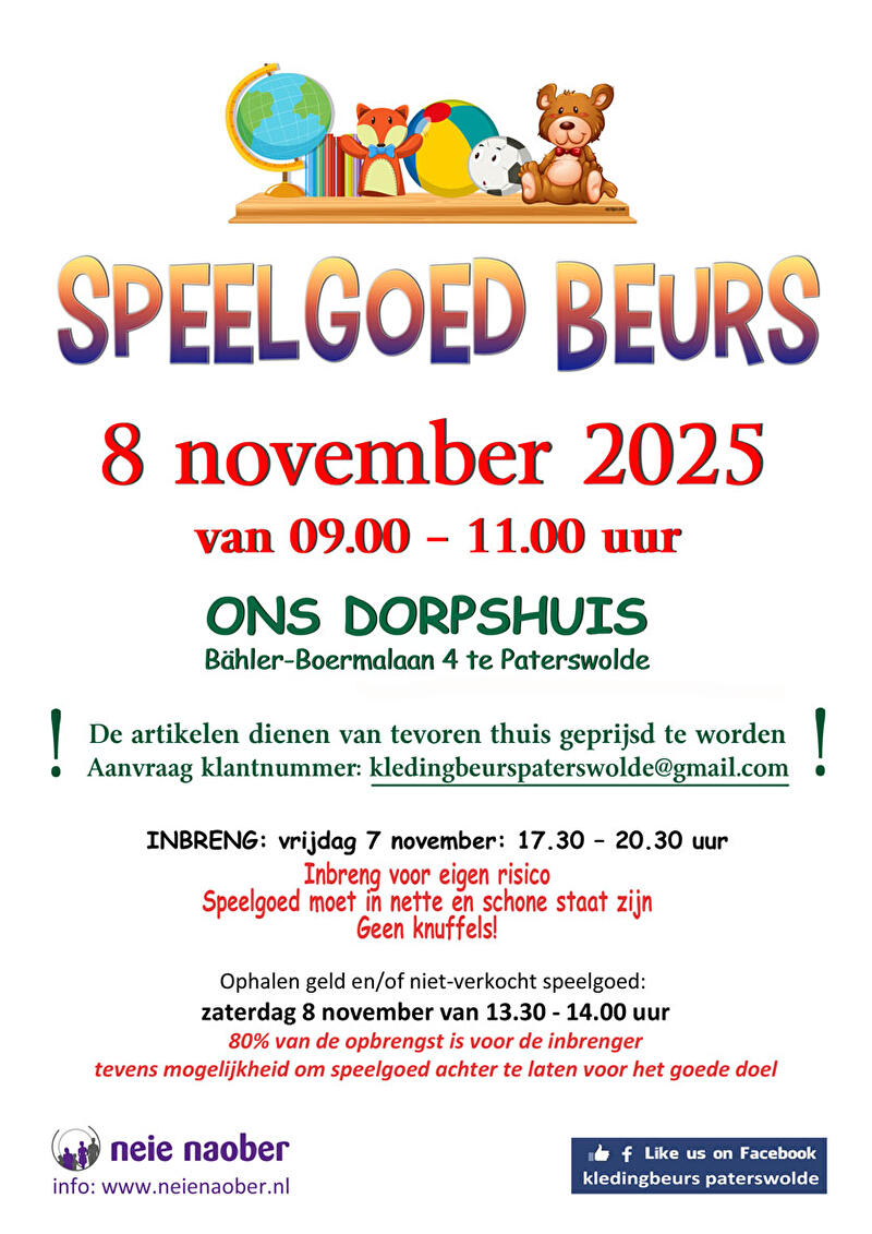 Je kunt je speelgoed op vrijdag 7 november tussen 17.30-20.30 uur naar het Dorpshuis brengen. Het speelgoed moet je thuis van tevoren zelf prijzen. Vraag een klantnummer aan door een mail te sturen naar: kledingbeurspaterswolde@gmail.com. Je ontvangt dan een klantnummer, instructie en een inbrenglijst.